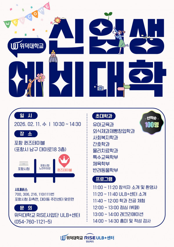 신입생 예비대학 페이지 정보 작성자 학부관리자 작성일26-02-04 15:41 조회76회 댓글0건 관련링크 다음글 목록 본문 신입생 예비대학 안내드립니다.일시: 2026. 02. 11. 수 10:30 ~14:30장소: 포항 퀸즈테이블(포항시 남구 대이로18 3층)문의: 위덕대학교 RISE사업단 ULB+센터 (054-760-1121~5) 댓글목록 등록된 댓글이 없습니다. 다음글 목록